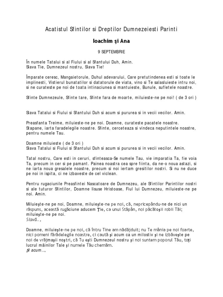 Împărate ceresc, mângâietorule, duhul adevărului, care pretutindeni ești și toate plinești, vistierul bunătăților și dătătorule de viață, vino și te sălășluiește întru noi și ne curățește pe noi de toată întinăciunea și mântuiește, bunule, sufletele noastre. Împărate ceresc, mângâietorule, duhul adevărului, care pretutindeni ești și toate plinești, vistierul bunătăților și dătătorule de viață, vino și te sălășluiește întru noi și ne curățește pe noi de toată întinăciunea și mântuiește, bunule, sufletele noastre. Pentru aceasta si noi, ca cei ce suntem luminati cu sfanta taina a … Slava tie, dumnezeul nostru, slava tie! I n numele tatalui si al fiului si al sfantului duh, amin. Al cel ceresti, al celor pamantesti si al celor de dedesubt. Acatistul cuvioasei maicii noastre parascheva [ format word: Împărate al veacurilor şi doamne cel mai înainte de veci, făcătorule a toată făptura cea văzută şi cea nevăzută, dumnezeule cel slăvit în sfânta treime, căruia se închină tot genunchiul;